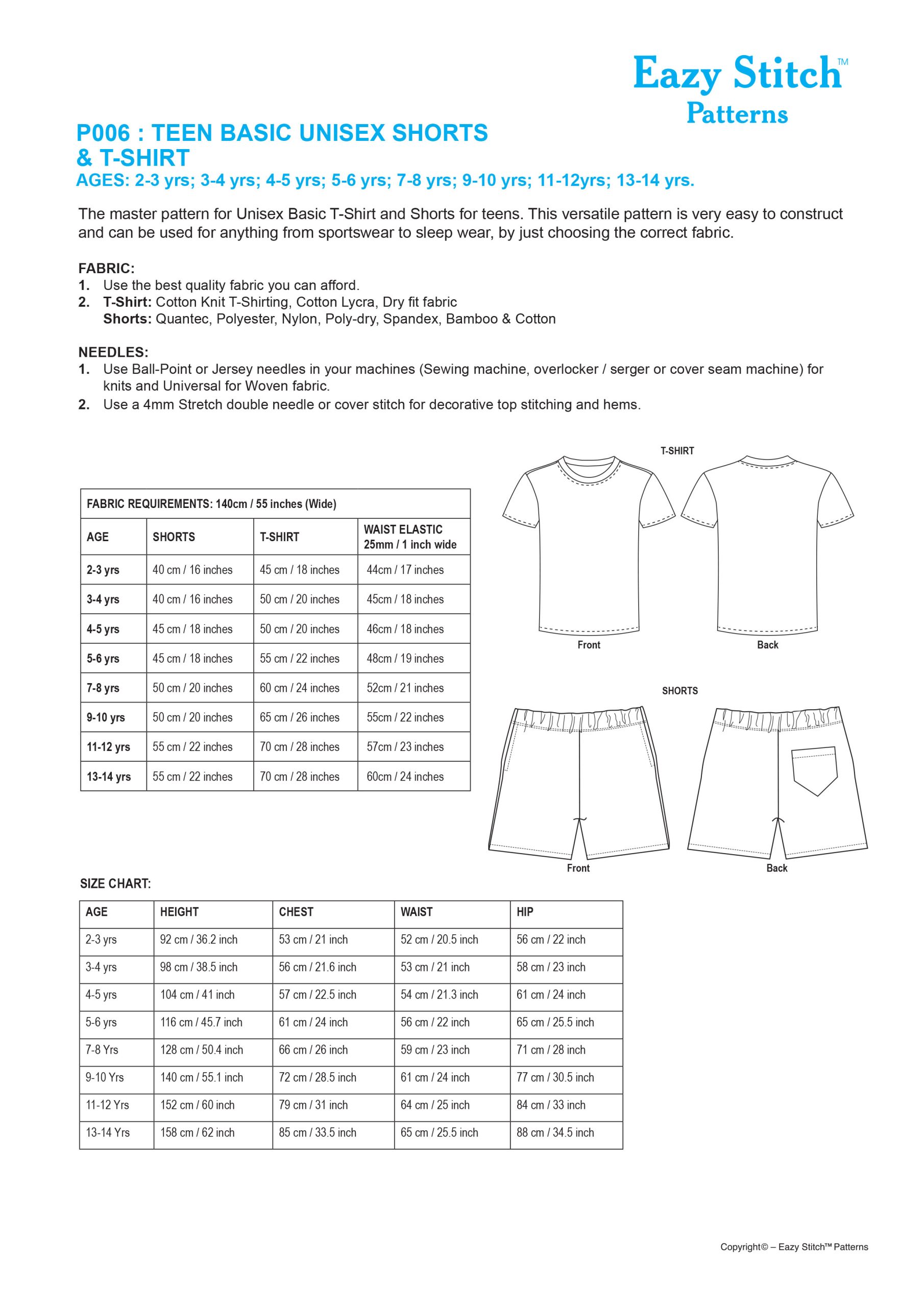 The master pattern for Unisex Basic T-Shirt and Shorts for kids to teens. This versatile pattern is very easy to construct and can be used for anything from sportswear to sleep wear, by just choosing the correct fabric.